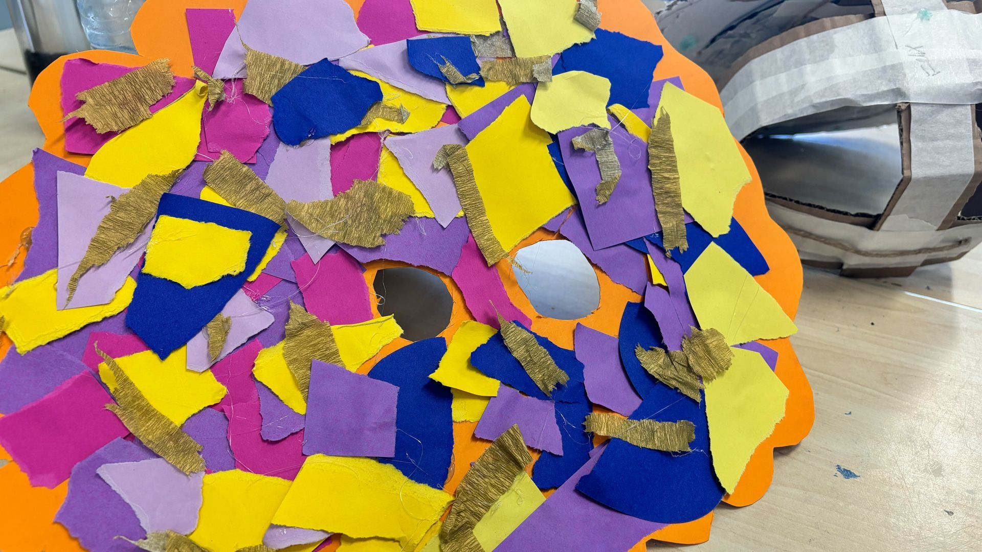 Het kunstproject is een samenwerking met de leerkracht. Het muzikale gedeelte wordt begeleid door de leerkracht, die met de kinderen repeteert en bijvoorbeeld met boomwhackers het ritme versterkt. Als beeldend docent begeleid ik de leerlingen bij het maken van maskers in tweetallen: kleurrijke, sierlijke zeedieren én hoekige, krachtige fossielen in aardetinten.